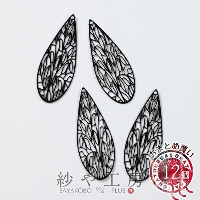 チャーム 透かしパーツ ドロップ ブラック 45mm 12個 1雫型 しずく 透かし模様 アクセサリーチャーム リーフ 葉脈 翅 約4.5cm アクセサリーパーツ パーツ メタルパーツ 材料 問屋 ハンドメイド資材 幾何学 さや工房 手作り
