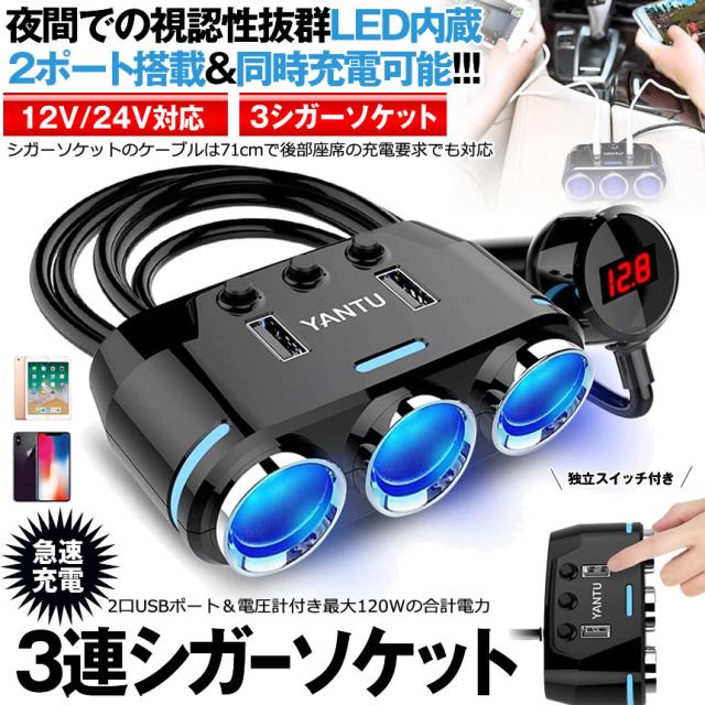 シガーソケット分配器 3連 2口 USBポート 増設 カーチャージャー 電圧計 車載充電器 12V 24V 対応 カー用品 自動車 急速充電QC3.0 LED付
