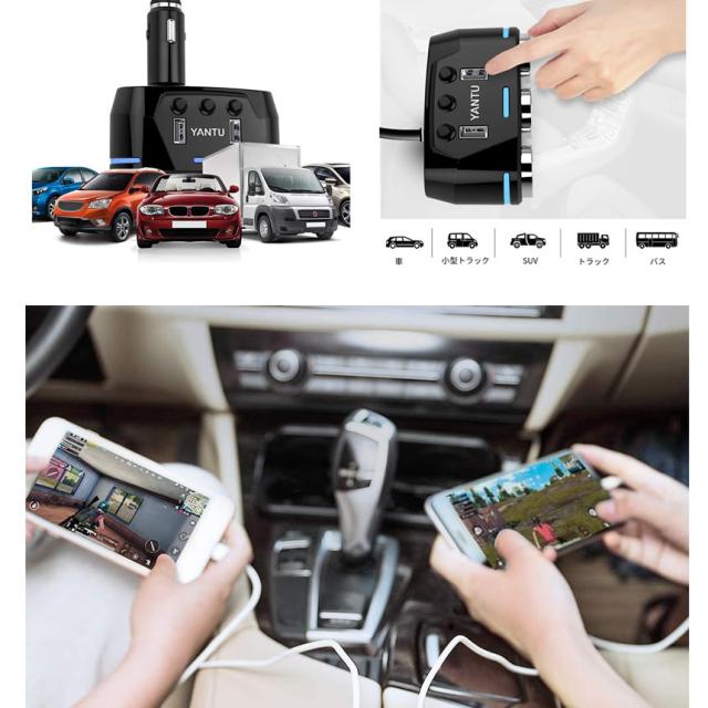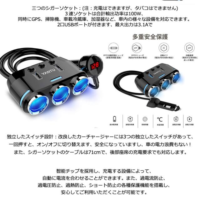 独立したスイッチ設計:改良したカーチャージャーには3つの独立したスイッチがあって、一回押すと、オン/オフに切り替えます、安全になっていますし、車の電力浪費もない! また、シガーソケットのケーブルは71cmで、後部座席の充電要求でも対応します。
