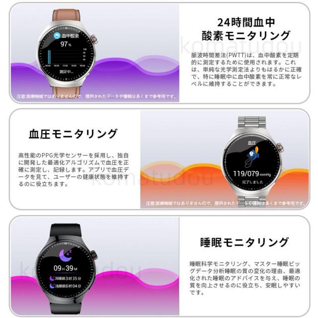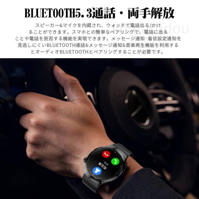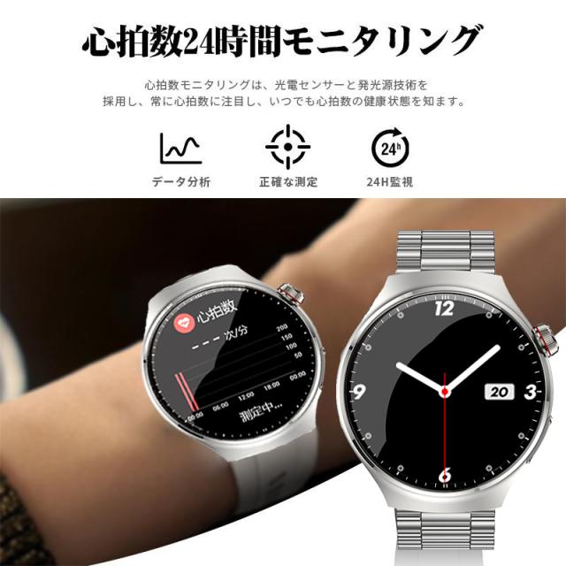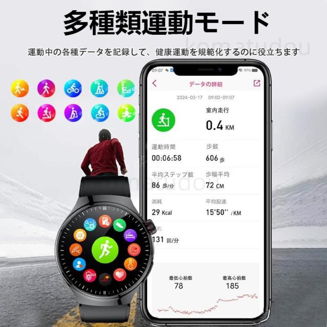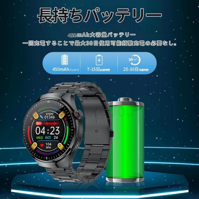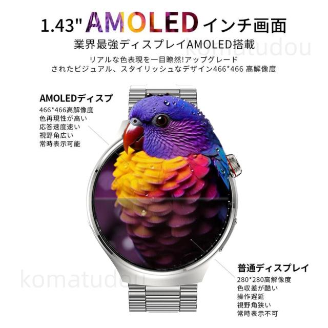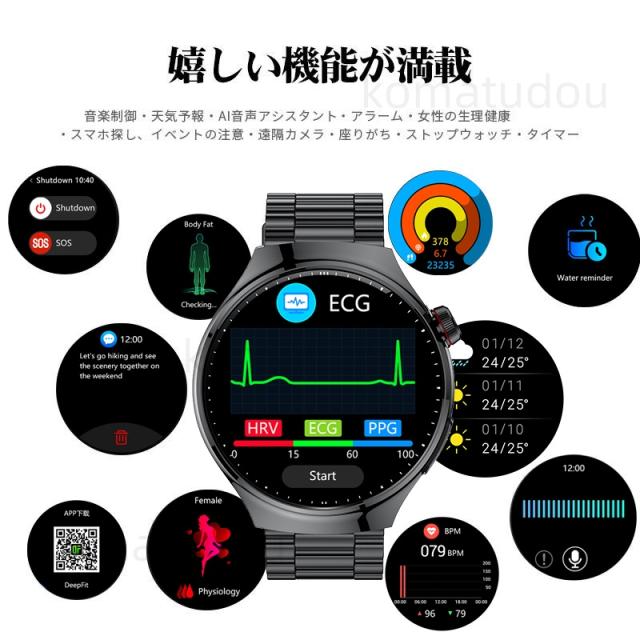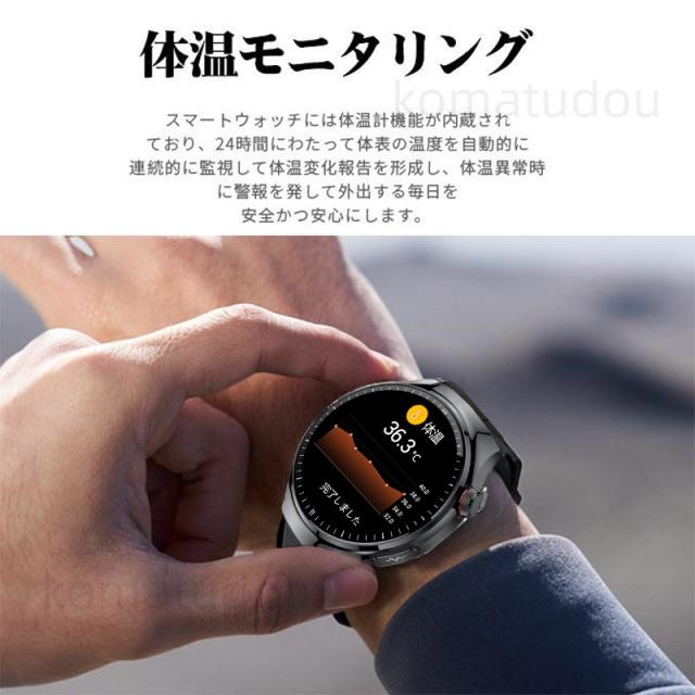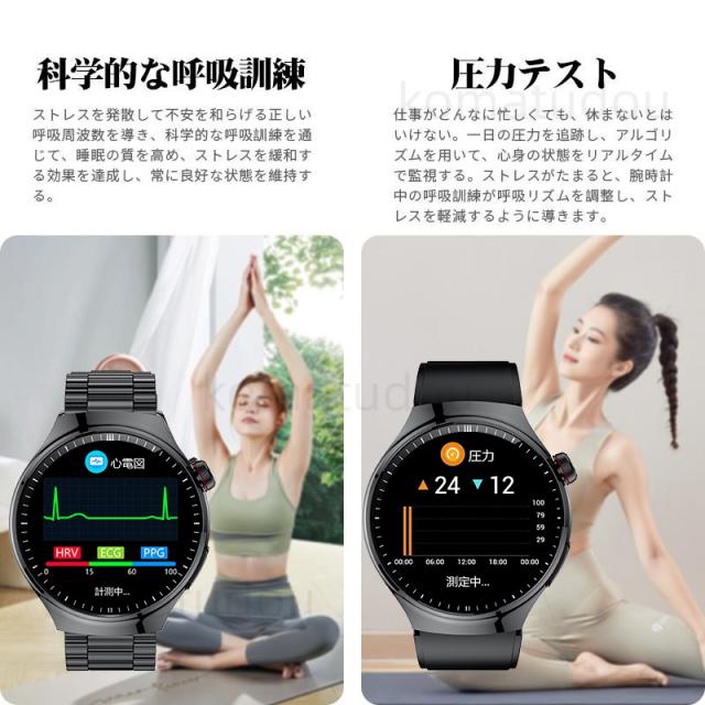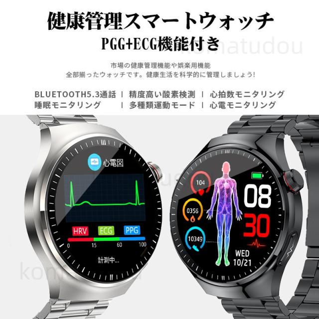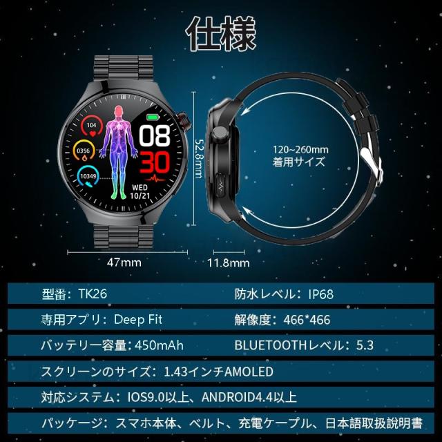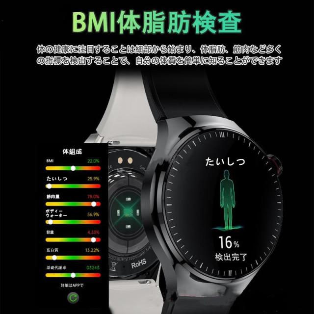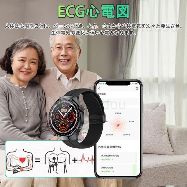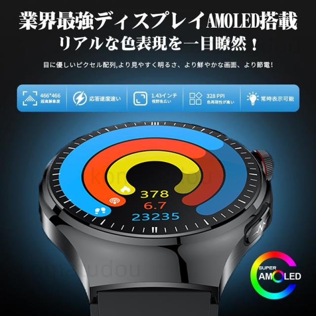 スマートウォッチ 心電図ECG 日本製センサー 保護フィルム付く AMOLED 丸型 体脂肪BMI 血中酸素 体温測定 高精度心拍数 睡眠管理 男女兼用1.43インチ ストレス iphone android 対応
