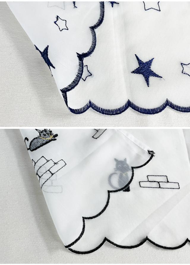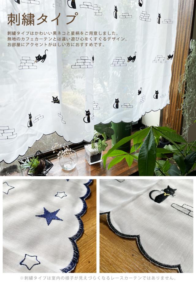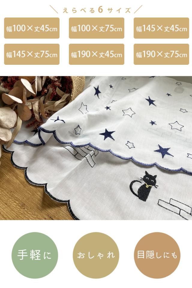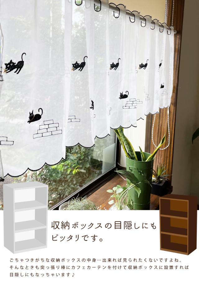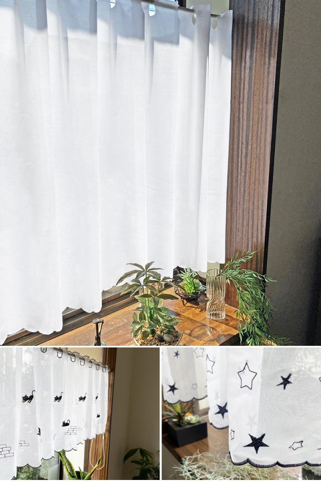 - 出窓の目隠し用に付けました。サイズもピッタリ白に黒猫ちゃんの刺繍がとても可愛いです。お店の対応も早くて良かったです。