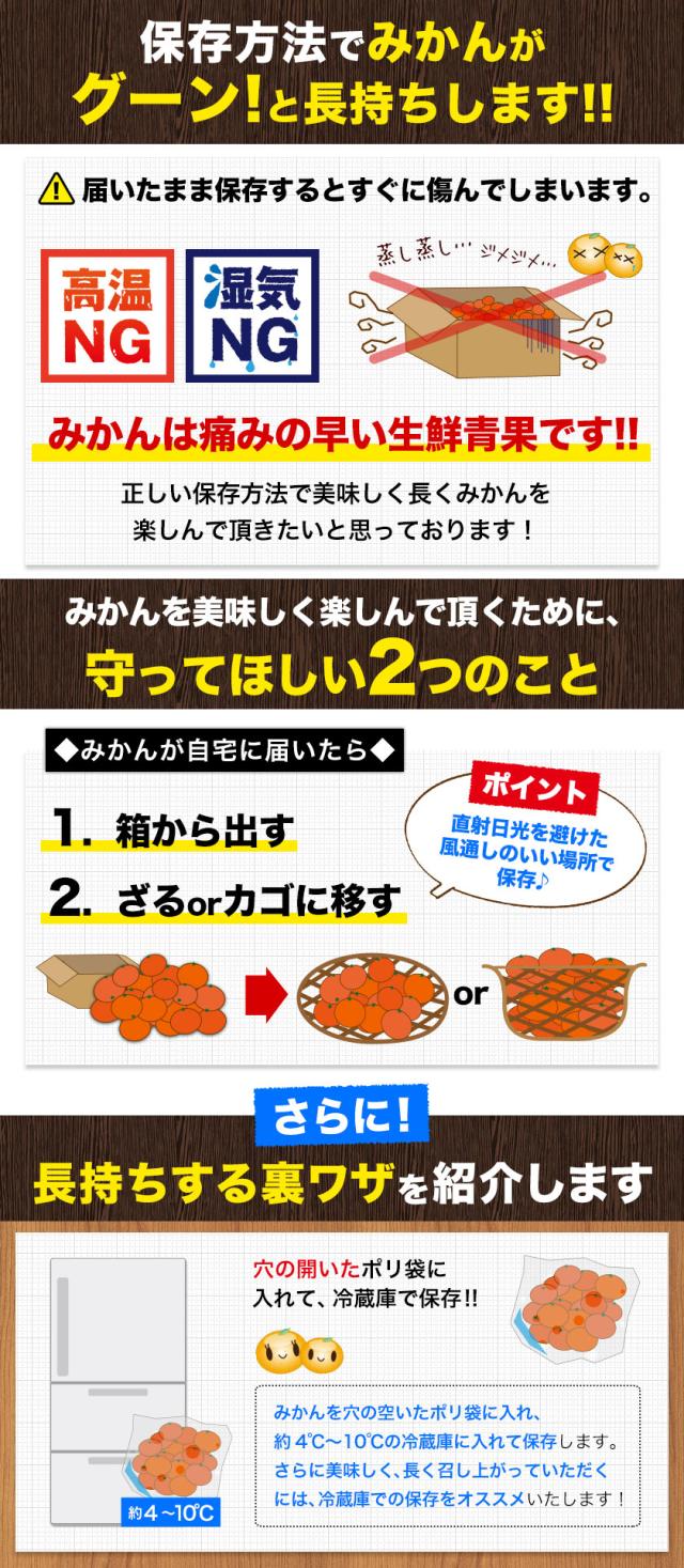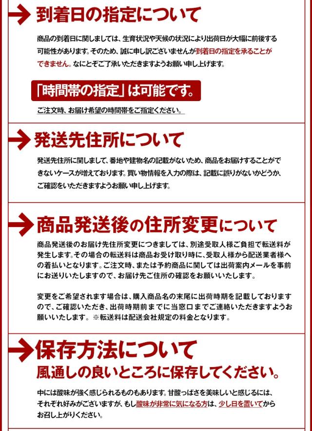 ■保存方法:直射日光の当たらない、風通し良く涼しい冷暗所で保存してください。冷暗所や冷蔵庫などで保管もオススメです。冷蔵庫の野菜室で保存する場合は、ポリ袋などに入れて乾燥を防いでください。 召し上がる順番は、できるだけ箱の底にあった商品からがオススメです。生ものですので、傷みが発生した場合は周りに移る前に、すぐに取り除いていただきますようお願いいたします。