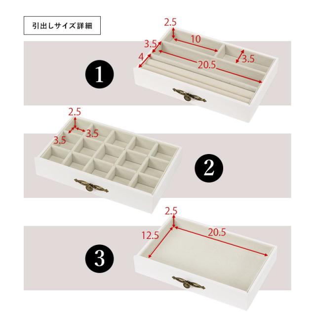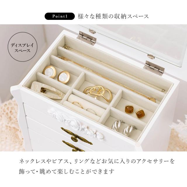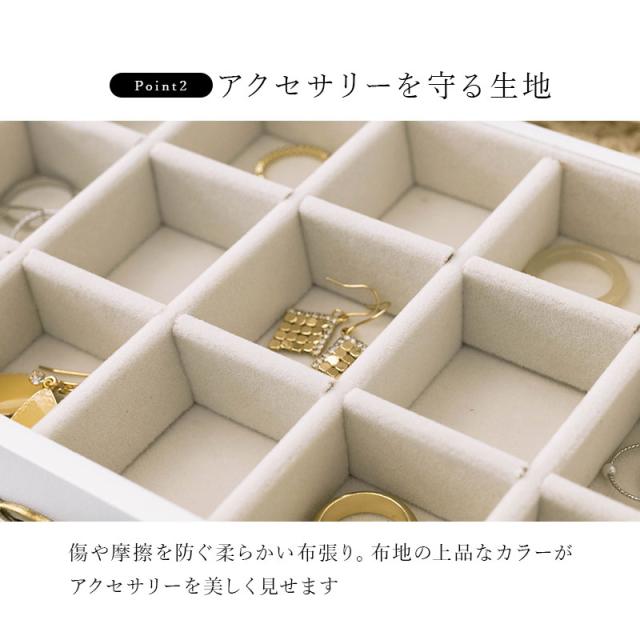 ネックレスやリング、ピアスやイヤリング、時計やブレスレット、ヘアアクセサリーなど、一通りの装飾品が収納可能な大容量タイプ。