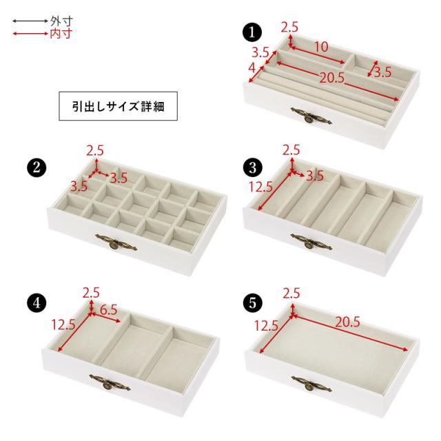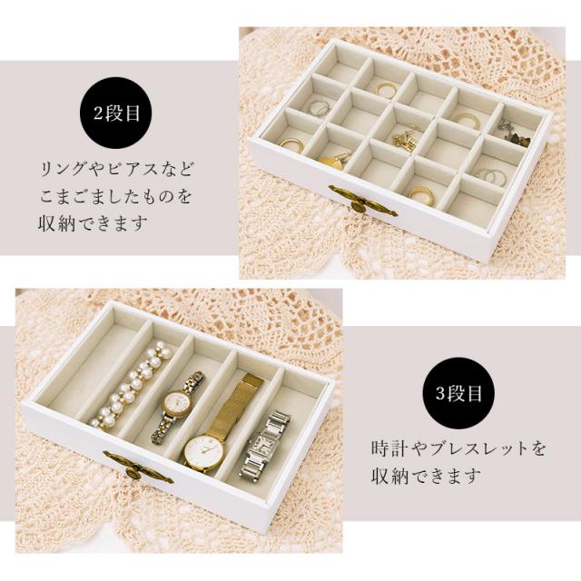 ネックレスやリング、ピアスやイヤリング、時計やブレスレット、ヘアアクセサリーなど、一通りの装飾品が収納可能な大容量タイプ。