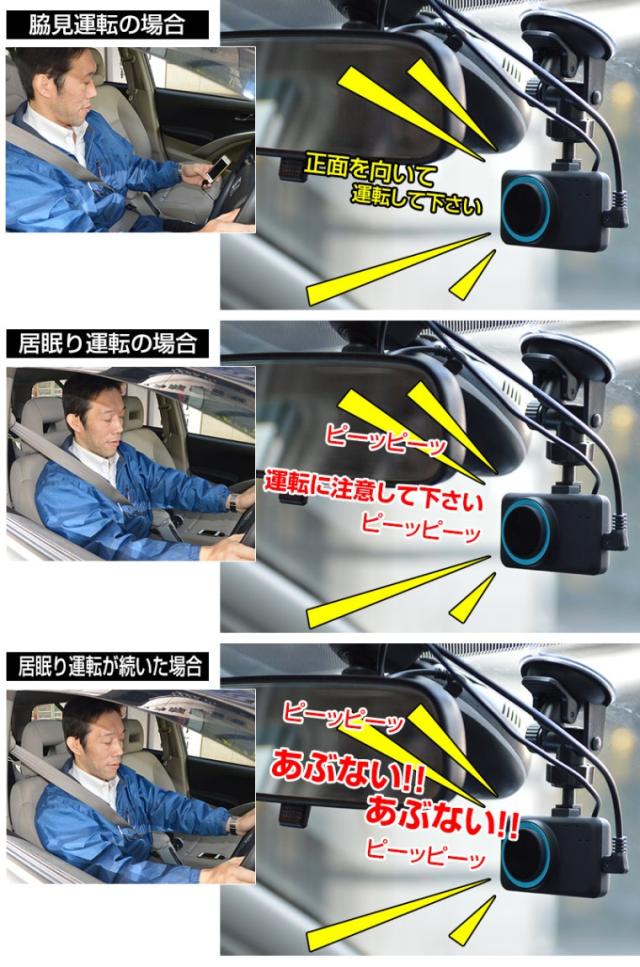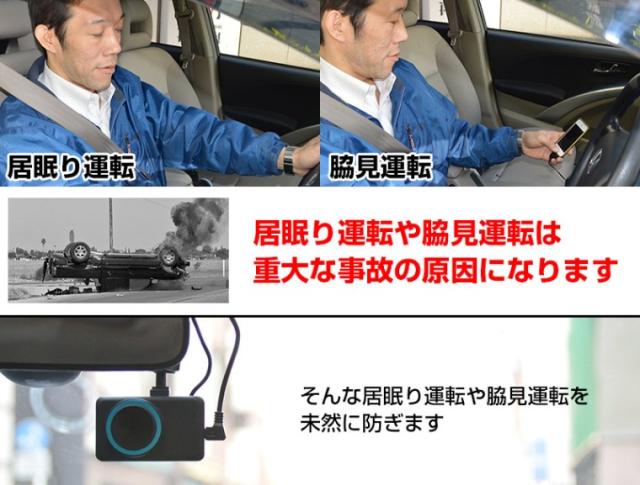 ■あくびやスマートフォンを見ながらのわき見運転にも注意を促します。居眠り運転、よそ見運転、わき見運転、事故を未然に防ぐ1つの対策として有効な装置となります。