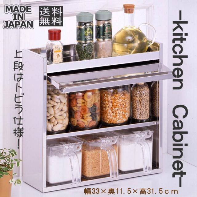 スパイスラック ステンレス フラップ扉 ストッカー3個付き おしゃれ 調味料ラック 薄型 スリム キャビネット カウンター上 収納棚 燕三条 日本製