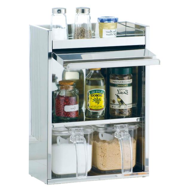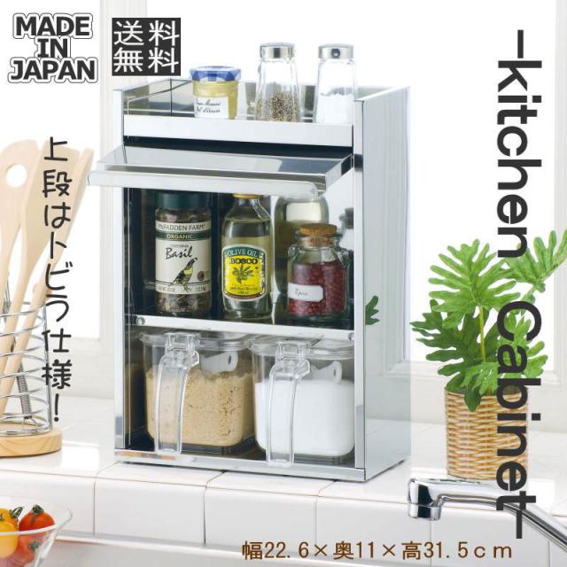 スパイスラック ステンレス フラップ扉 ストッカー2個付き おしゃれ 調味料ラック 薄型 スリム キャビネット カウンター上 収納棚 燕三条 日本製