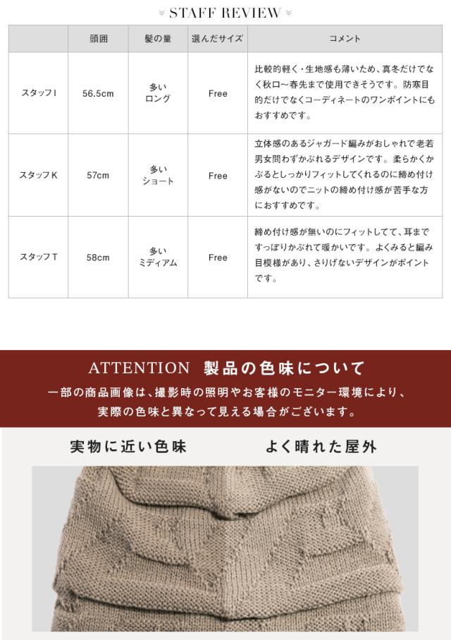 | ・高さは平置きの高さを記載しています。 ・ニット製品は、生産過程上、プレス加工・製品洗い加工によって形やサイズに誤差が生じる場合がありますが品質上の問題はありません。 ・頭囲・高さのサイズ表記は、5ミリ前後の誤差が生じる場合があります。計測サイズは目安としてお考えください。 ・お取り扱いの前に品質ネームタグの記載内容をご確認ください。 ・ご覧頂くモニターの発色具合によって実物と色が異なって見える場合があります。 ・単品商品の撮影画像が実際の商品と色合いが近くなっていますので、ご参照ください。 ・同商品でも、染色過程で色味が多少変わる場合があります。 |