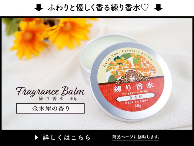 | 説明 | キンモクセイのリアルな香りに限りなく近づけたアロマエッセンスです。 秋を感じさせる甘くフローラルな香りが特徴です。 香りの持続力も強く、少量でもしっかりとした香りをお楽しみいただけます。 ベースノート:ジャスミン・ピーチ トップノート:ペアー・新緑 ミドルノート:キンモクセイ・ローズ |