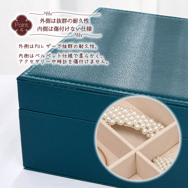 【貴重なジュエリーを守る高品質のレザー】表面は汚れに耐えるPUレザーを採用し、撥水加工も施されているので、ぬれタオルで拭くだけで、宝石箱をきれいに保つことができます。裏地は非常に柔らかいベルベット生地で作られていて、手触りが良く、貴重なジュエリーを傷から守ります。