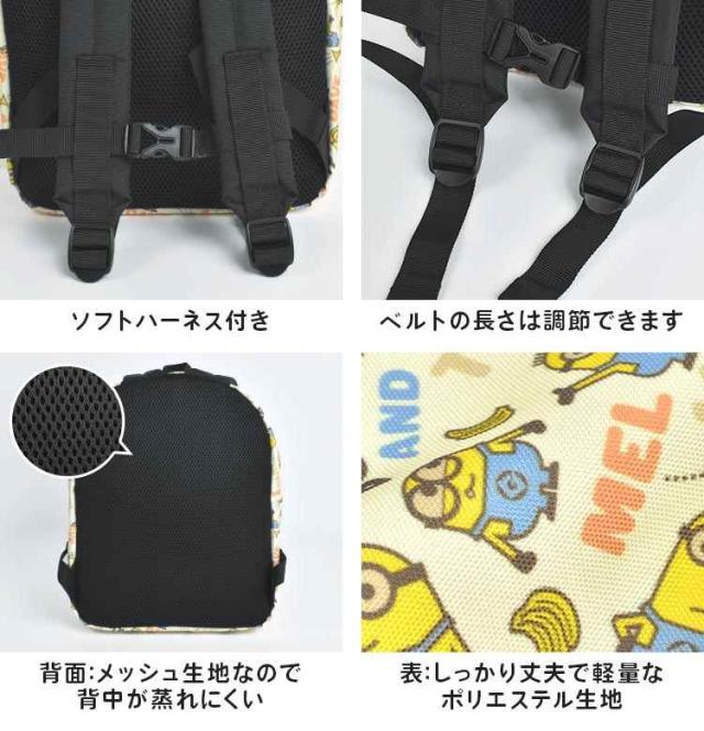 女の子も男の子も背負いやすい、淡いイエローカラーとミニオンが可愛いデザインのキッズデイパック。通園・通学はもちろん、遠足やテーマパークへのお出かけにオススメのリュックです。弁当箱・水筒・着替え・筆記用具など一気に収納できる容量13Lサイズ!(A4サイズもギリギリ収納可能) また、動き回るお子さまも安心のソフトハーネス付きなので、肩からベルトがずれ落ちにくくなっています。内側に名前や住所が書けるネームタグ付き。背面はメッシュ生地なので、暑い季節でも背中が蒸れにくい仕様になっています。