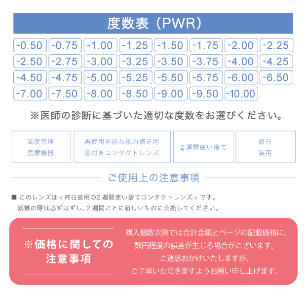 【度数(PWR)】-0.50D〜-6.00D(0.25Dステップ)/-6.50D〜-10.00D(0.50Dステップ)