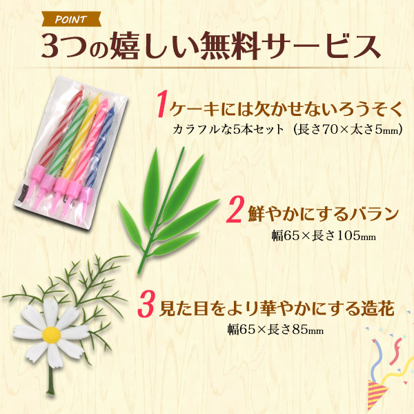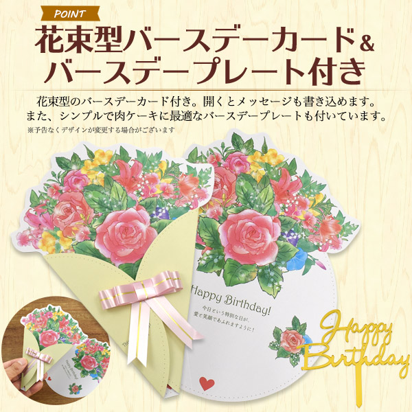 【付属品】花束型バースデーカード(約185×145mm)、バースデープレート(約85×47mm ※文字部分)、ろうそく×5/バラン/造花