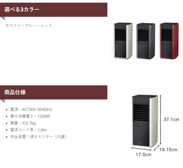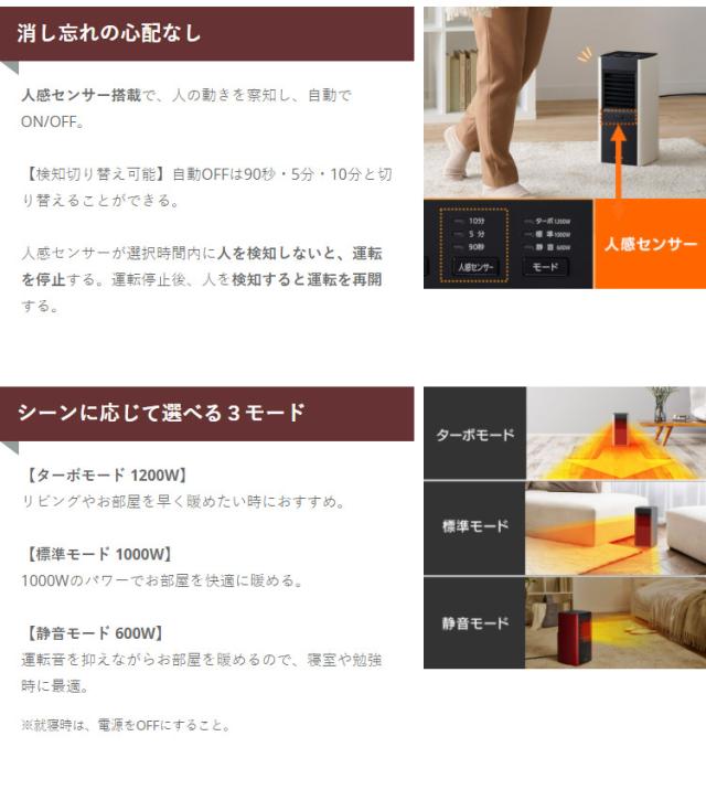 - 機械音が多少気になりますが、部屋が暖かくなるスピードは早いです。軽いので家中どこにでも持ち運べるので利便性に優れています。人感センサーの時間と温風の強さが三段階から選択出来るのもありがたいです。色のレ...
