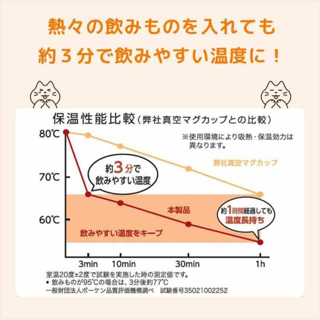 \熱々が苦手な猫舌さん必見!/ 「飲みやすい」が長持ちする不思議なマグカップのご紹介です。 普通の保温タンブラーはいつまでも暑すぎて飲めない。 そんな悩みを持った猫舌さんのために作った不思議なマグカップです。 真空断熱層より内側に吸熱材を入れることにより、 「熱すぎる」をすばやく吸熱!! 約3分で飲みやすい温度となり1時間温度を保ちます。 猫舌な知人へのプレゼントにもぴったりなアイテムです♪