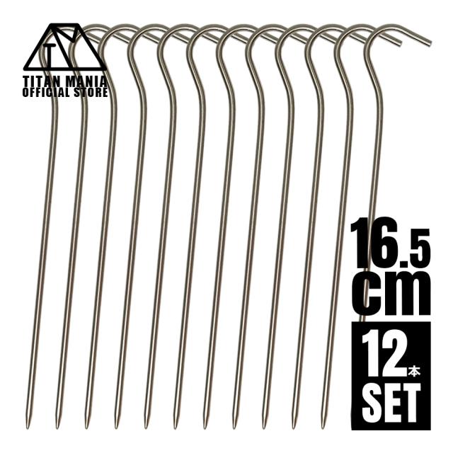 TITAN MANIA チタンマニア ペグ チタン製 超軽量 12本セット チタンペグ ピンペグ ソリッド 16.5cm 山地 砂利 草地 硬い地面 テントペグ キャンプ 設営用具 収納袋付き
