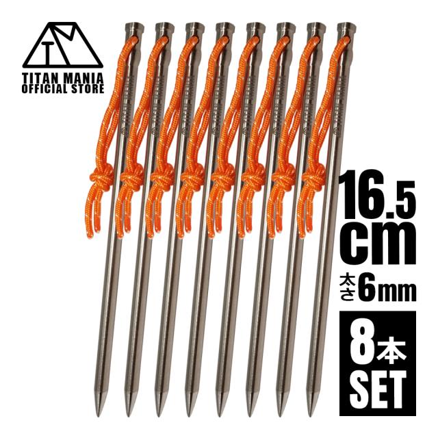TITAN MANIA チタンマニア ペグ チタン製 チタンペグ ソリッド 超軽量 強靭 直径6mm 16.5cm 8本セット 山地 砂利 草地 硬い地面 ネイルペグ キャンプ 設営用具 収納袋付き