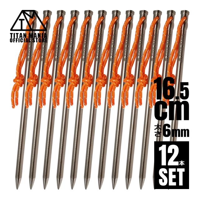 TITAN MANIA チタンマニア ペグ チタン製 チタンペグ ソリッド 超軽量 強靭 直径6mm 16.5cm 12本セット 山地 砂利 草地 硬い地面 ネイルペグ キャンプ 設営用具 収納袋付き