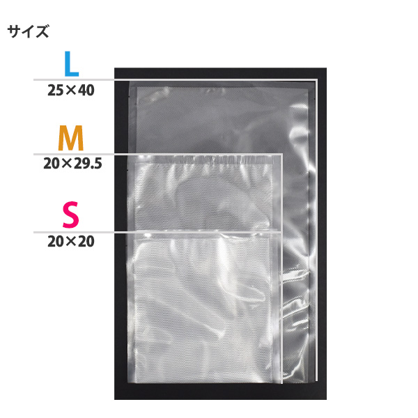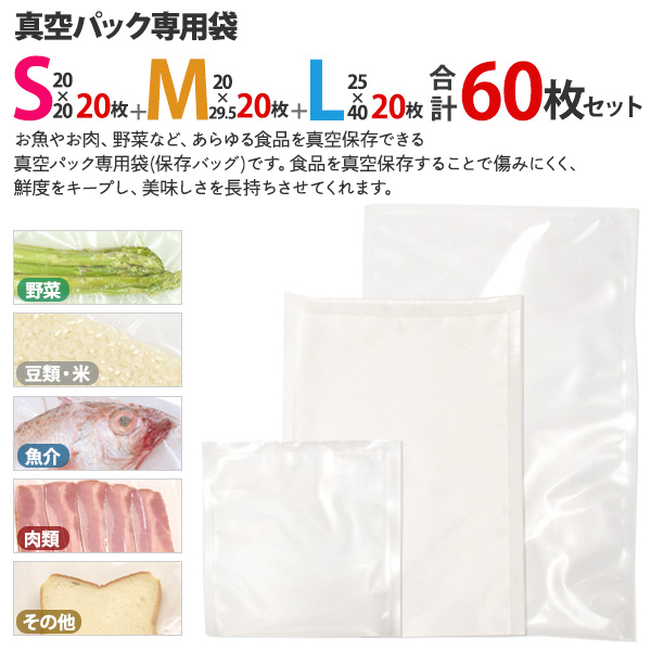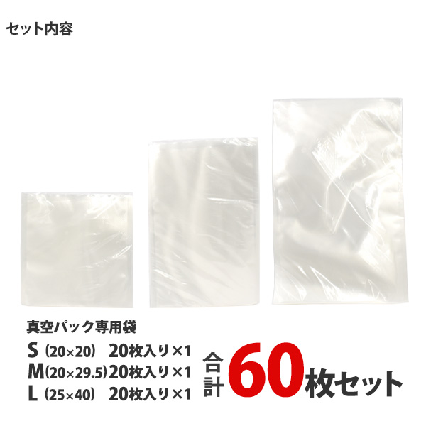 真空パック専用袋 60枚セット Sサイズ 20×20cm Mサイズ 20×29.5cm Lサイズ 25×40cm 各20枚 エンボス加工 保存バッグ 小分け袋