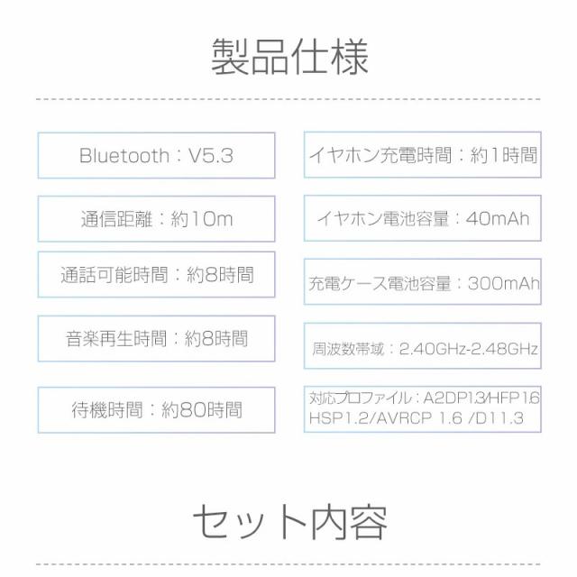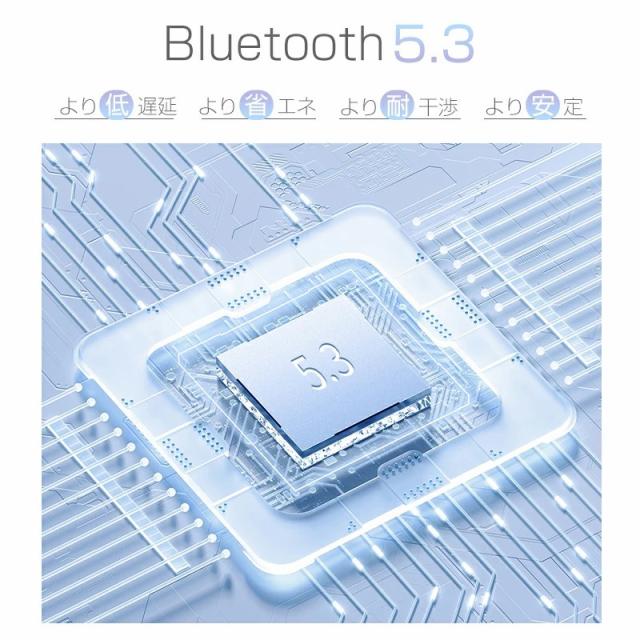 V5.3のBluetooth規格を採用しているので、より高速で安定した通信が実現でき、接続性は良くて、「音飛び」や「音切れ」を大幅に改善することができます。伝送距離も10-15Mまでに達します(障害物なし)。