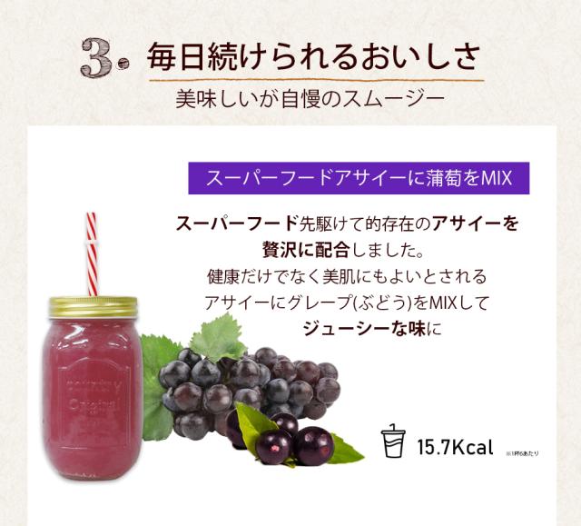 【原材料】水溶性食物繊維、おから末、チアシード、サイリウムハスク末、植物油脂、グルコマンナン、アサイー末(マルトデキストリン、アサイー(果肉))、イソマルトオリゴ糖、マキベリー果汁末、植物発酵エキス末、植物発酵食品(糖類、野菜類(ヨモギ、ウコン、スギナ、ドクダミ、トチュウの葉、クコの実、ハトムギ、アマチャズル、タンポポの根、ツユ草、クマザサ、オトギリソウ、甘草、ツルナ、ハブ草、アマドコロ、イチジク葉、霊芝、その他)、野菜、果物(人参、玉ねぎ、パセリ、ショウガ、リンゴ、ミカン、メロン、グレープ、その他)、海藻類(コンブ、ノリ))、ミネラルイースト、穀物麹(大麦、あわ、ひえ、きび、タカキビ、紫黒米、米粉)、穀物発酵エキス、乾燥野菜混合粉末(大麦若葉、ケール、さつまいも、ほうれんそう、南瓜、人参、桑の葉、大葉)、乳酸菌末(デキストリン、乳酸菌(殺菌))、甘味料(ソルビトール、アスパルテーム・L-フェニルアラニン化合物)、クエン酸、増粘多糖類、香料、ブドウ色素、卵殻未焼成カルシウム、乳化剤、ビタミンC、抽出ビタミンE、ナイアシン、パントテン酸カルシウム、ビタミンB1、ビタミンB6、ビタミンB2、ビタミンA、葉酸、ビタミンD、ビタミンB12(原料の一部に卵、小麦、乳成分、大豆、リンゴ、バナナ、オレンジ、キウイフルーツ、ヤマイモ、ゴマ、カシューナッツを含む)