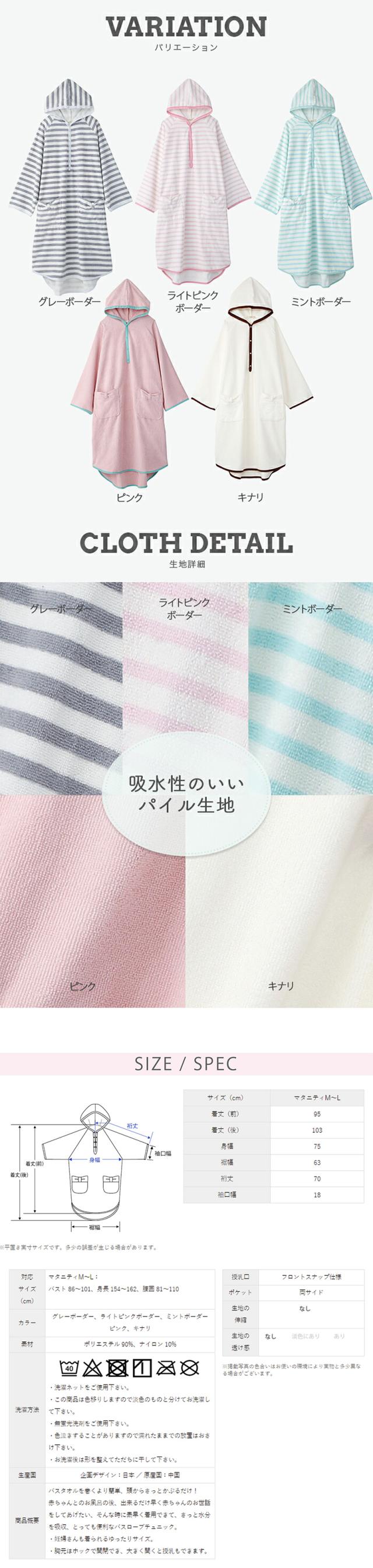 | お風呂あがりにさっとかぶるだけ、人気のバスローブチュニック♪ ワンオペタイムの強い味方、お風呂あがりのお子様のお世話にとっても便利なバスローブチュニックです。 バスタオルよりも簡単!パイル生地のゆったりとしたチュニックですので、お風呂上がりに頭からさっとかぶって吸水できます。しっかり吸水して、ママの湯冷めも防止します。 洗髪後の雫をカバーできる大きめのフード付きで、雫がぼたぼた落ちにくいようになっています。 止め外しの簡単なスナップボタンを開くと、授乳口に早変わり。入浴後そのまま授乳ができます。 小物の持ち運びに使えるポケット付きです。立ったり座ったりしやすいよう、前後の丈を変えています。 産前〜産後、その後も長く着用いただけ、「使ってよかったアイテム」としてたくさんの方に支持されています。 マタニティ仕様のゆったりサイズで使いやすくプールやジム通いの方にも人気です。 | |