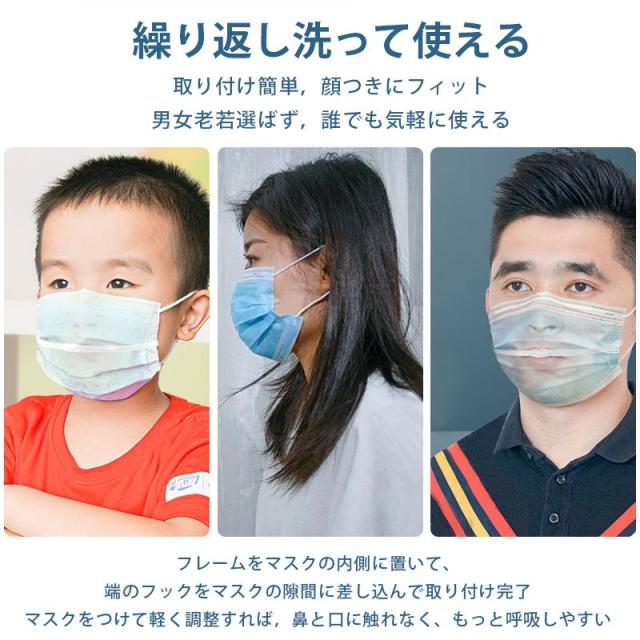- マスクが顔につかない、呼吸がしやすい、などを謳った商品を色々と試して来ましたが、顔にフレームが当たる、固定ができずに落ちてくる等の不満がありました。 こちらの商品はしっかりマスクに固定する事ができて、...