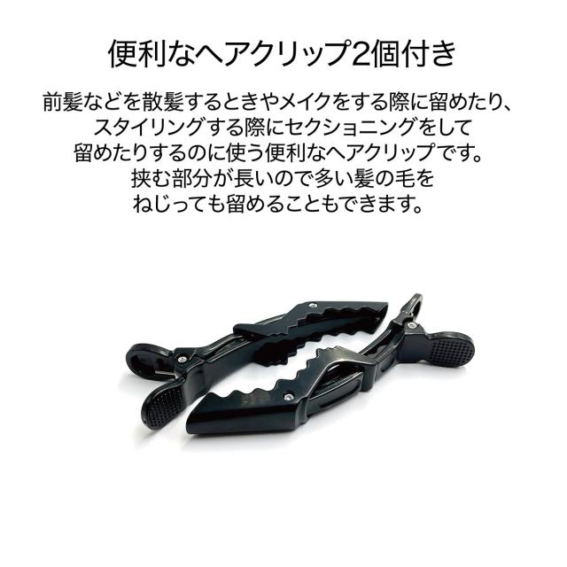便利なヘアクリップ2個付き。前髪などを散髪するときやメイクをする際に留めたりするのに使う便利なヘアクリップです。