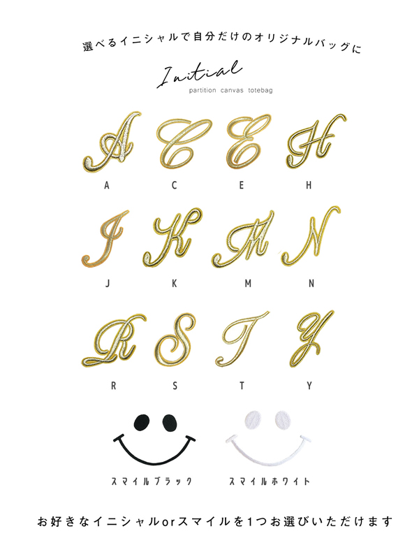 ※お選びいただけるイニシャルは、刺繍イニシャル・刺繍スマイル 又は イニシャルバッグチャームのどちらかとなります。