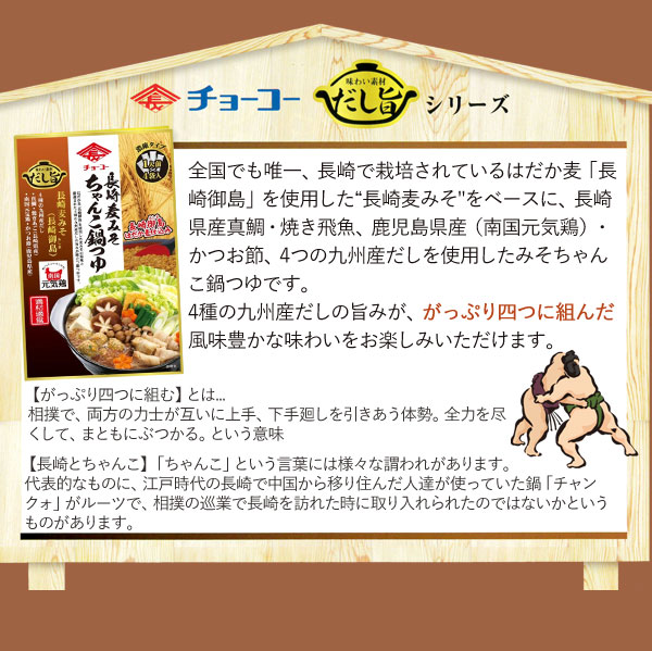 長崎でのみ栽培されている、はだか麦「長崎御島」を使用したチョーコーの「長崎麦みそ」をベースに、長崎県産の真鯛と焼き飛魚(あご)、鹿児島県産の南国元気鶏とかつお節、4つの九州産だしを使用した「みそちゃんこ鍋つゆ」です。
