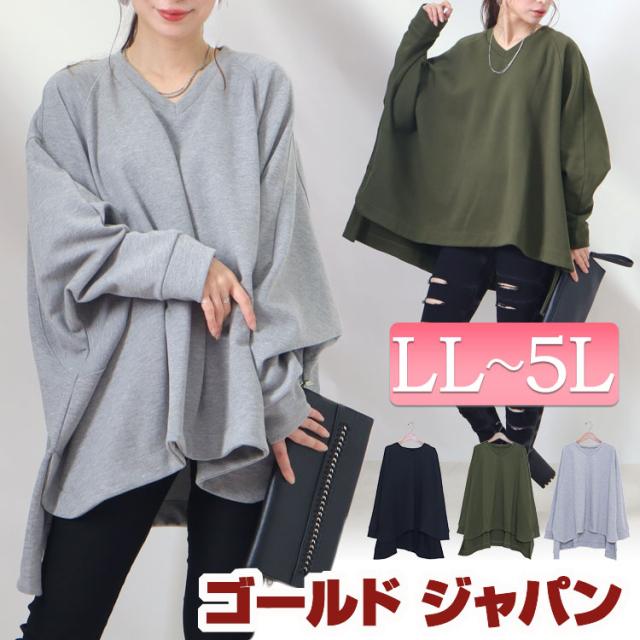 秋新作 大きいサイズ レディース トップス カットソー ダンボールニットプルオーバー Vネック 長袖 ドルマン スリット テールカット ダンボールニット ストレッチ ドロップショルダー 無地 フレア 秋服 冬服 LL 2L 3L 4L 5L ブラック 黒 グレー カーキ ゴールドジャパン