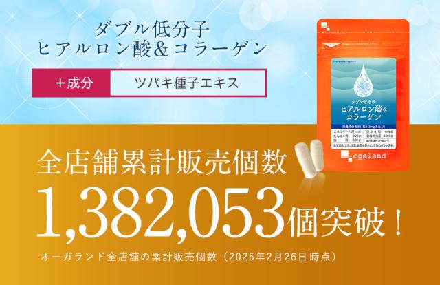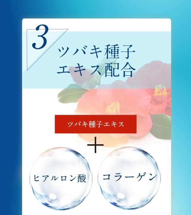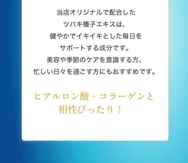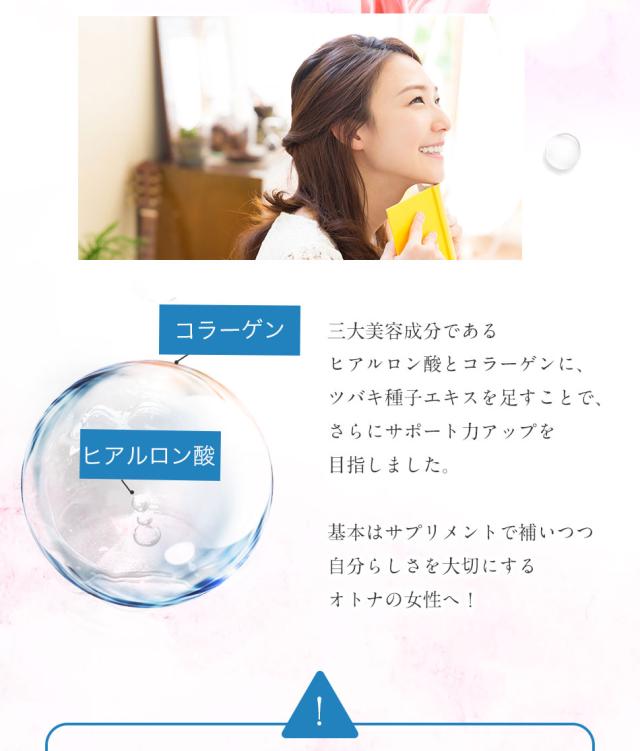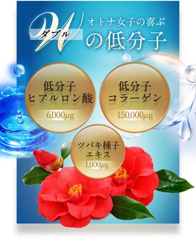 主要原料(1カプセルあたり):フィッシュコラーゲンペプチド 150mg / ヒアルロン酸 6mg / 椿種子エキス末 1mg