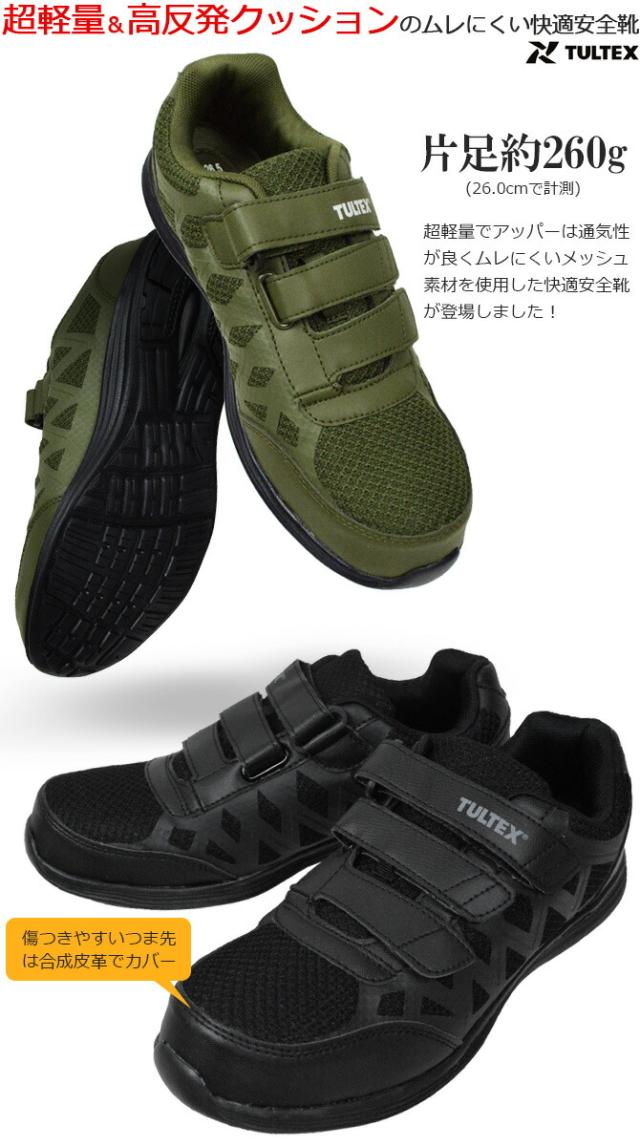 | TULTEX(タルテックス)のつま先部分に樹脂先芯が入った軽量タイプの安全靴AZ-51665です。 踵の内部に高反発EVAのスーパークッションを搭載しており、足が疲れにくく立ち仕事や歩く仕事でも快適です。 アッパーは通気性が良くムレにくいメッシュ素材を採用し、快適なフィット感も実現しています。 片足260g(26.0cm)と超軽量で、女性サイズにも対応しています。 | ||||||