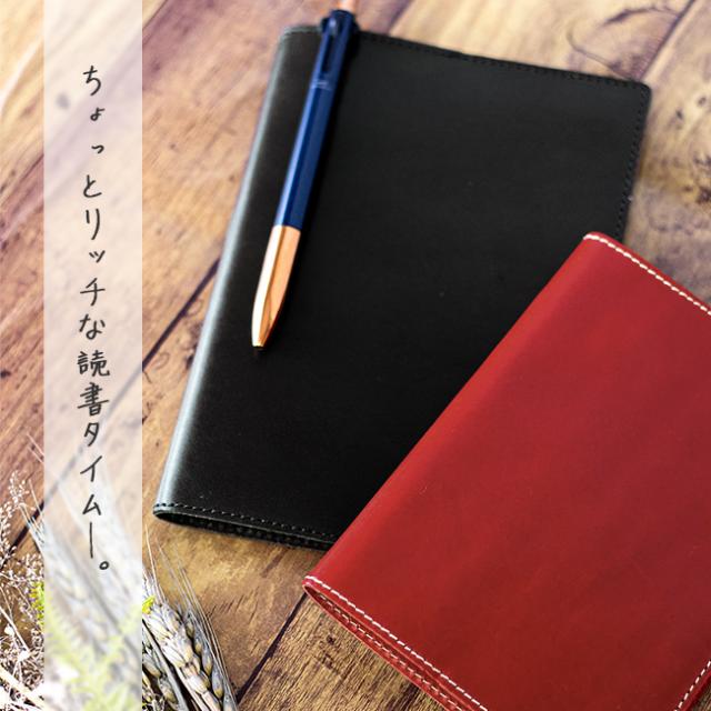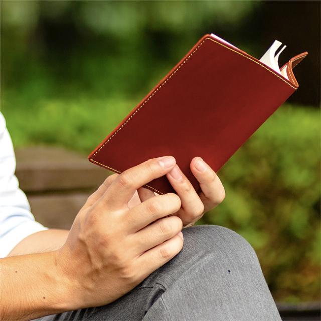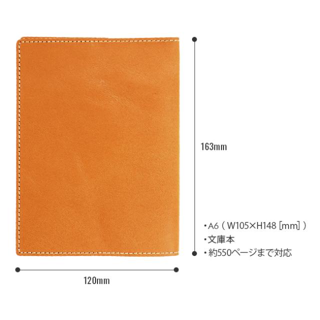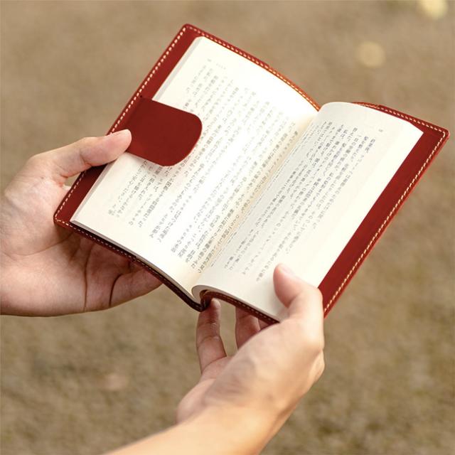 | 文庫本やA6サイズのコンパクトな手帳・ダイアリーが装着できるレザーブックカバーです。約550ページまでの文庫本が収納可能。ページ数に合わせて調節の必要はありません。開いて左側についている革のスリットは、本の間に差し込めば栞のようにお使いいただけます。 |
