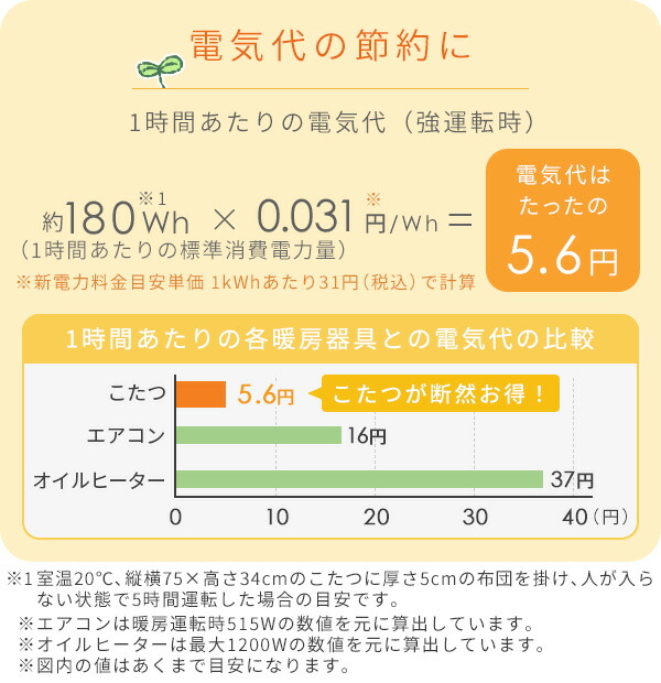 | 商品説明 | ●電源:100V (50Hz/60Hz) ●消費電力:510W ●ヒーター型番:NCHF-500 ●電気代目安(1時間あたり):(強)約5.6円、(弱)約2.6円 ●中間入切スイッチ ●継脚付きで高さが4段階で調節可能(38/48/55/65cm) ●届いてすぐに使える布団セット ●コード収納ボックス付 ●冬はこたつ、夏はテーブルとして使用可能 ●メーカー保証:1年 |