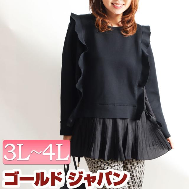 秋新作 大きいサイズ レディース トップス カットソー プルオーバー プリーツドッキングフリルプルオーバー フェイクレイヤード ドッキング 長袖 フリル プリーツ リボン 長袖 ストレッチ 伸縮 フレア 切替え クルーネック 秋服 冬服 3L 4L ブラック 黒 ゴールドジャパン