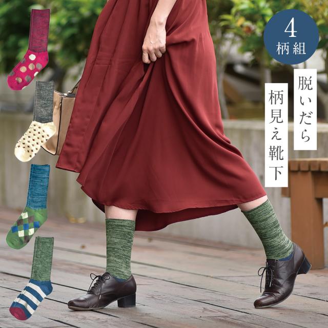 靴下 レディース 秋冬 【4柄組】 22-25cm 可愛い 柄 秋 冬 おしゃれ かわいい 丈長 ロング 【 脱いだら可愛い柄ソックス 】 まとめ買い 4足 セット カジュアル アーガイル ボーダー ドット ポップデザイン丈長ソックス