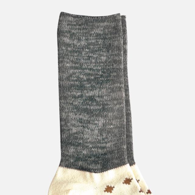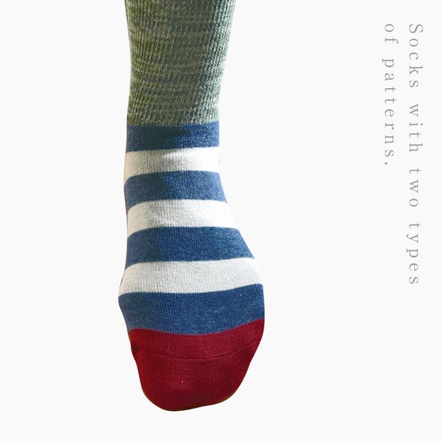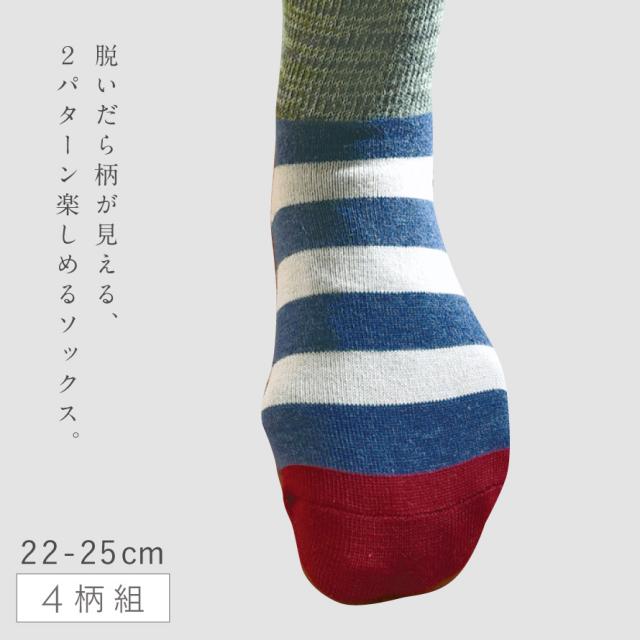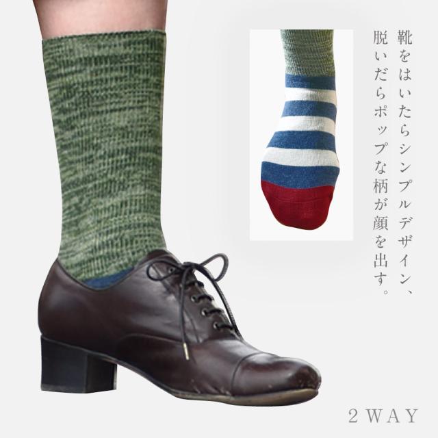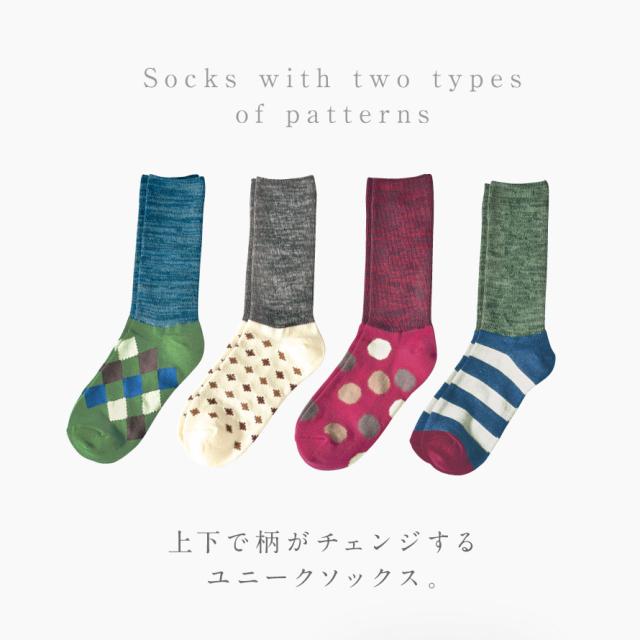 上下で柄がチェンジするユニークソックス。靴をはいたらシンプルデザイン、脱いだらポップな柄が顔を出す、ユニークな2wayソックス。