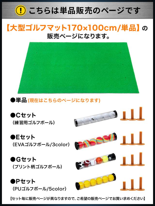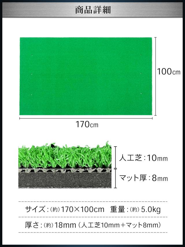 サイズは縦幅170cm×横幅100cm×厚さ18mm(人工芝10mm+土台SBRマット8mm)、カラーはグリーン、素材/材質はSBR、PP(ポリプロピレン)人工芝、セット内容は特大ゴルフマット単品になります。