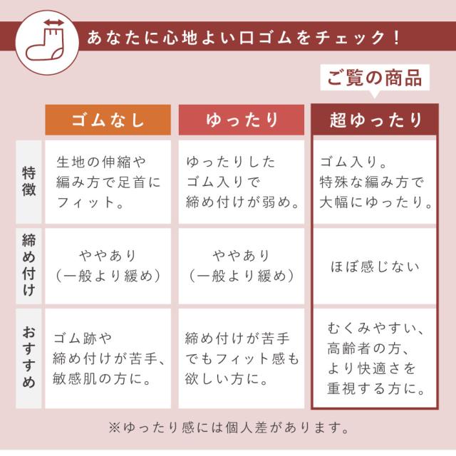 ふんわりやわらか、着脱もラクラクなソックス2色組。履き口部(口ゴム)が約30cm伸びる超ゆったり設計。足首ゆったりのタイプの靴下の中でも、かなりゆったりしたタイプになります。足首をしめつけず、むくみが気になる方にもおすすめです。