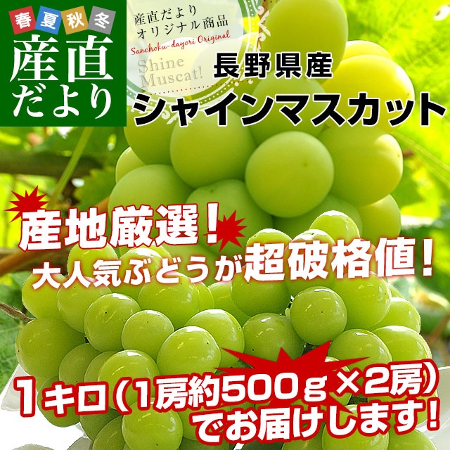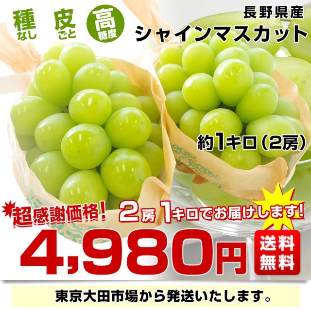 長野県産 シャインマスカット 約1キロ(2房)送料無料 ぶどう ブドウ 種なしぶどう 【発送時期:カート内に記載しております】