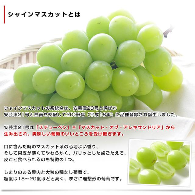 産地厳選!シャインマスカット!大人気のぶどうです。一度食べたらほとんどの方がファンになる、とっても甘くて種なしの皮ごと食べられる極上のマスカット「シャインマスカット」!糖度は20度以上になることもあるほど、とっても甘い葡萄です。