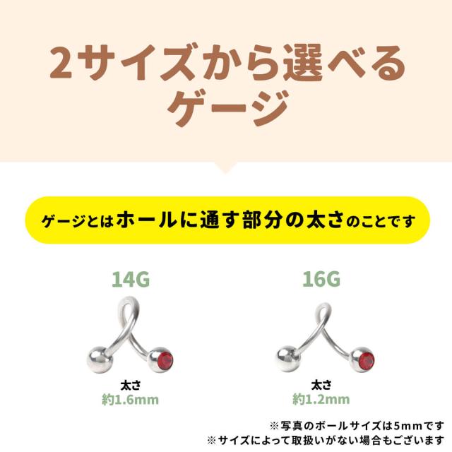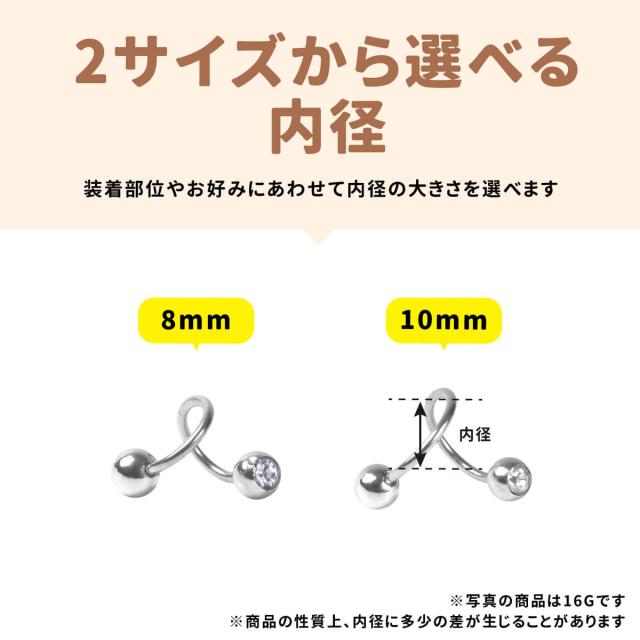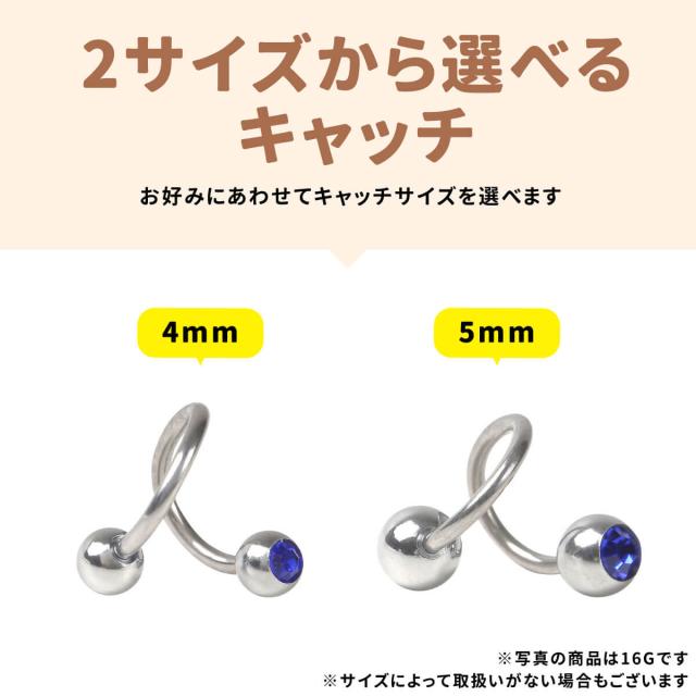 太さ14G,16G 内径8mm〜10mm キャッチサイズ4mm〜5mmのスパイラルバーベルです。