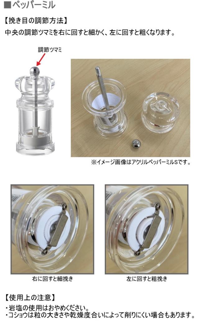 塩を補充する際は、塩がこぼれないように上部の穴を押さえてから行ってください。 ペッパーミルでの岩塩のご使用はおやめください。 コショウは粒の大きさや乾燥度合いによって削りにくい場合もあります。 |