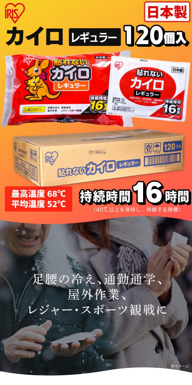 カイロ 貼らない 貼らないカイロ レギュラー 120枚 まとめ買い 使い捨て 16時間持続 貼れない 使い捨てカイロ あったかグッズ 温活 防寒 寒さ対策 冷え対策 通勤 通学 アウトドア 防災 備蓄 アイリスオーヤマ ぽかぽか家族 貼れないカイロ #