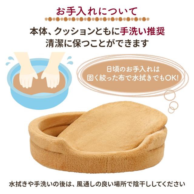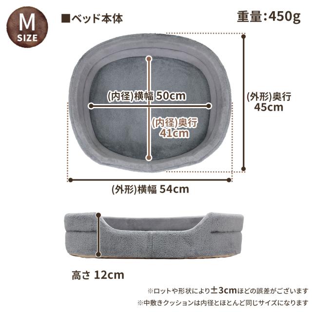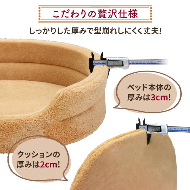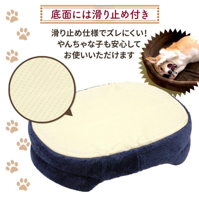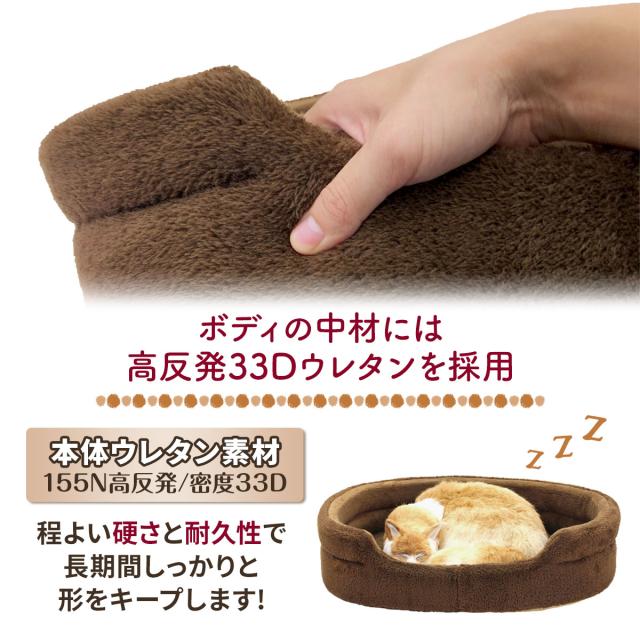 【ペットも大満足のふわもち感触】ふわふわの楕円型ペットベッドの登場です♪しっかりとした楕円型の丸まって眠りやすいフォルムで快適に過ごせます。ねこちゃん、わんちゃんが快適に過ごせるような質の高いペットベッドを目指しました。 【使い分けできるダブルの生地を採用】こだわりの2種類の生地「ボア生地」「フランネル生地」を採用。表にはもこもことした見た目の暖かいボア生地、内側はしっとり柔らかな感触のフランネル生地となります。中身は高反発33Dウレタンを使用しており、長期間しっかりと形を保ちます。 【簡単お手入れ・4サイズ展開で飼い主さんも嬉しい】お手入れの際は手洗いを推奨しております。底面には滑り止め加工が施されています。