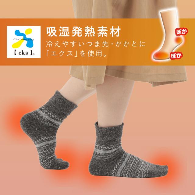 つま先とかかとに発熱素材を使用。口ゴムゆったりのノルディック調ソックス3柄組。