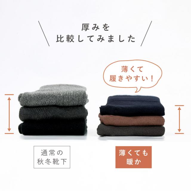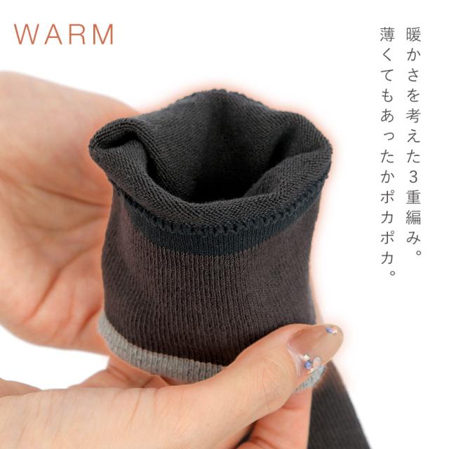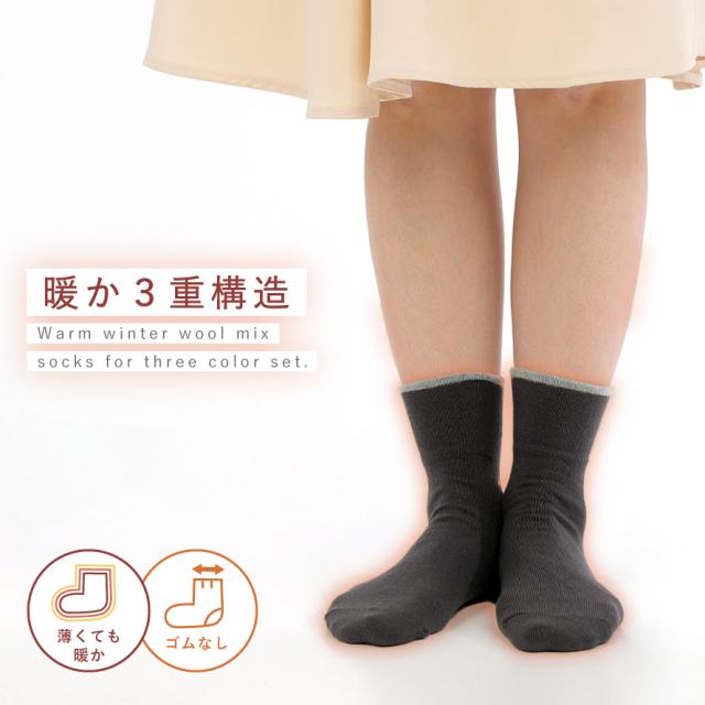 薄く暖かく丈夫!毛玉になりにくい三重構造のゴムなしソックス3色組。肌側に毛混糸、外側に丈夫で毛玉になりにくい綿混糸、中心には伸縮性のあるポリウレタン糸を使用しています。