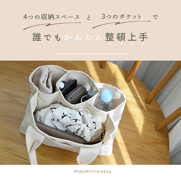 4つの仕切りと3つのポケットでスッキリ収納できる横長ミニトートバッグ。