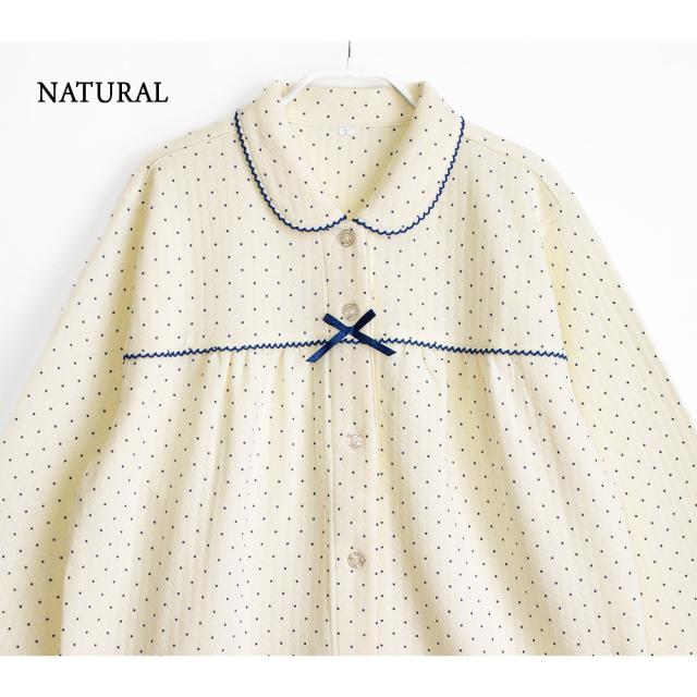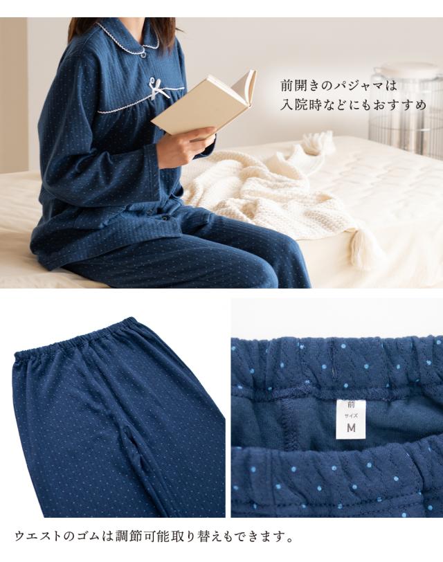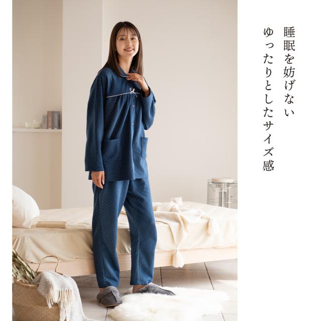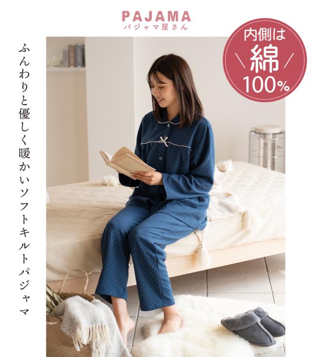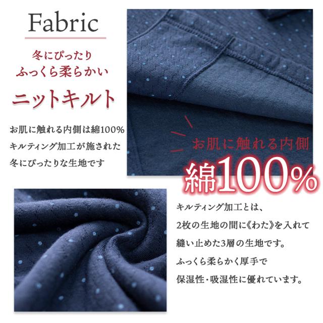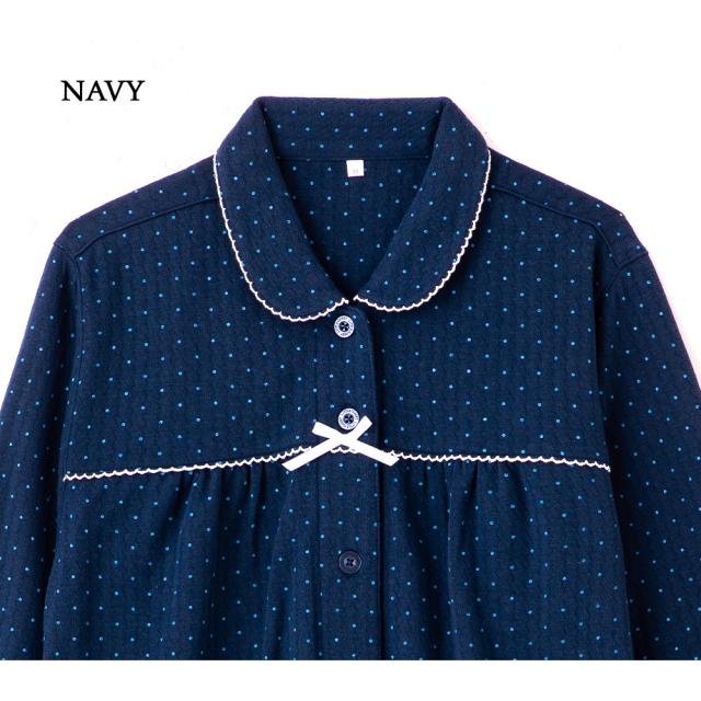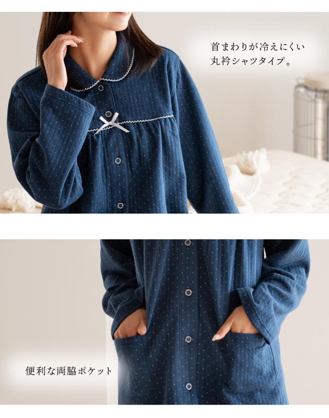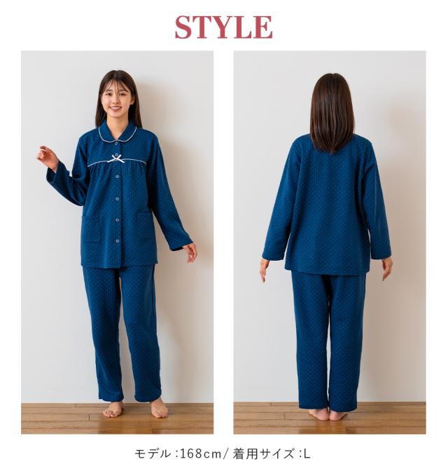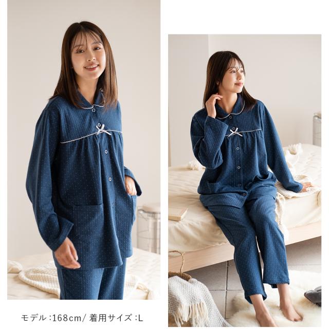 パジャマ レディース 内側が綿100% 長袖 冬 ふんわり柔らかなニットキルト ドット柄 前開き ボタン シャツ S M L LL 3L 親子 おそろい 67241